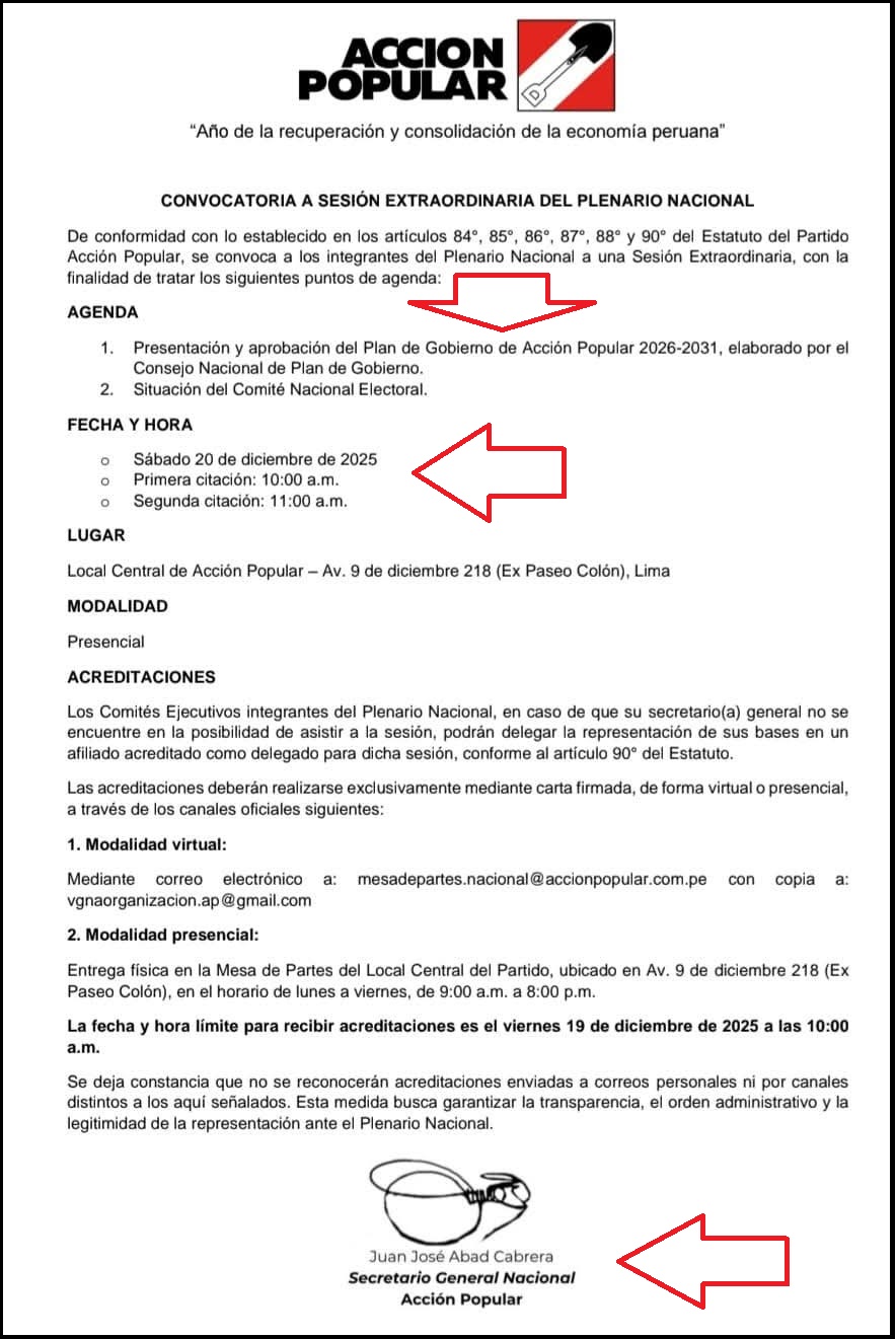 La segunda burla conocida proviene de Juan Abad al haber convocado a un plenario nacional el sábado 20 de diciembre para aprobar el plan de gobierno 2026-2031 y la situación (renovación) del CNE. Los tres suplentes no están completos y los que quedan no cumplen el perfil, por lo que deben elegirse a sus nuevos miembros, militantes de reconocida e intachable reputación partidaria.