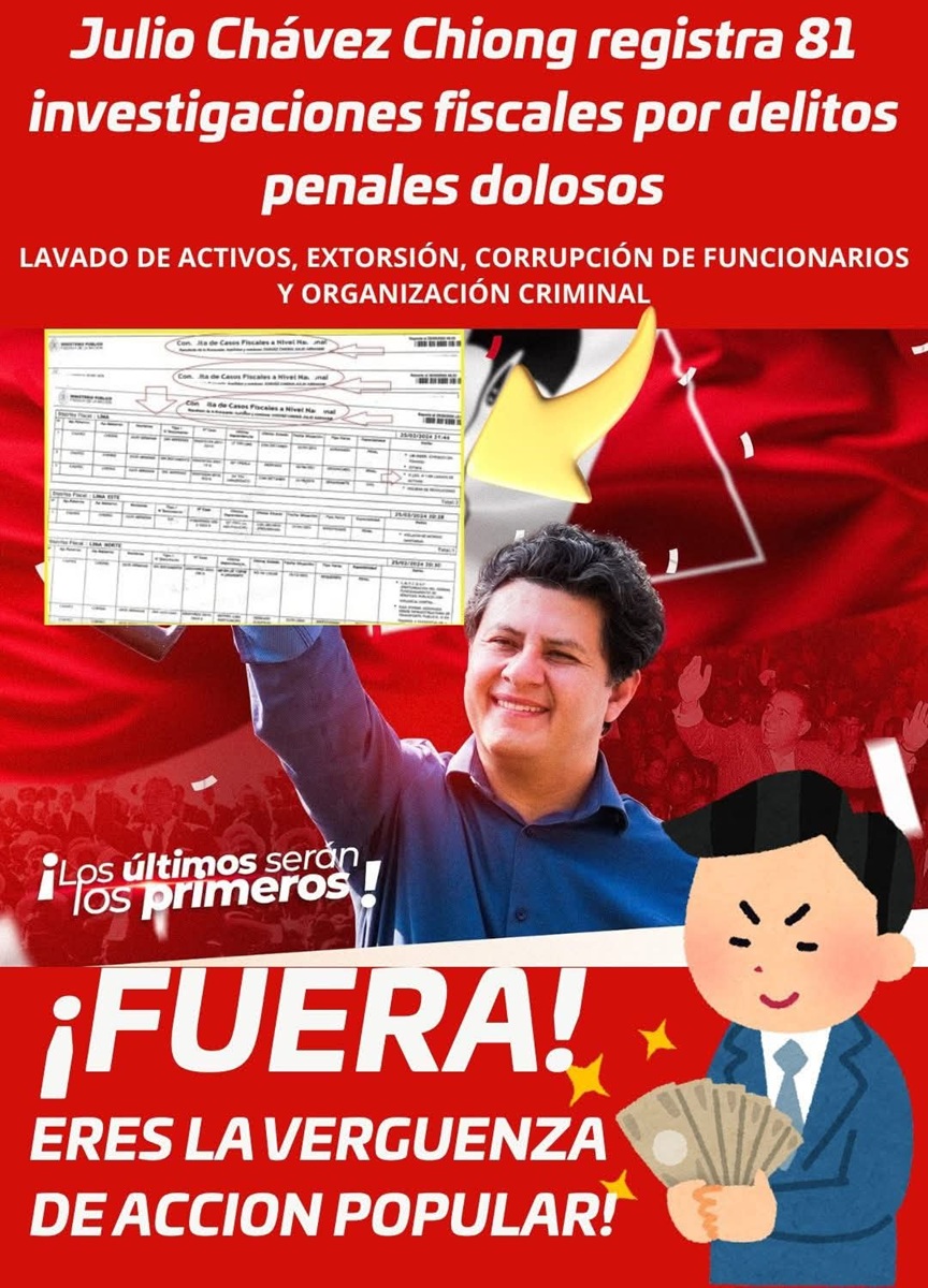 Hasta el 2024, Julio Chávez Chiong, antes y durante el ejercicio de alcalde San Martín de Porres había acumulado un total de 81 investigaciones fiscales por presuntos delitos dolosos, entre ellos lavado de activos, corrupción y organización criminal. Además, tiene pendiente una sentencia de seis años de cárcel por los delitos de peculado y falsedad genérica cuando se desempeñó como gerente de la municipalidad distrital de Morales, la que ha dilatado gracias a su condición de presidente de Acción Popular (replica.pe edición de fecha 30-07-2025).